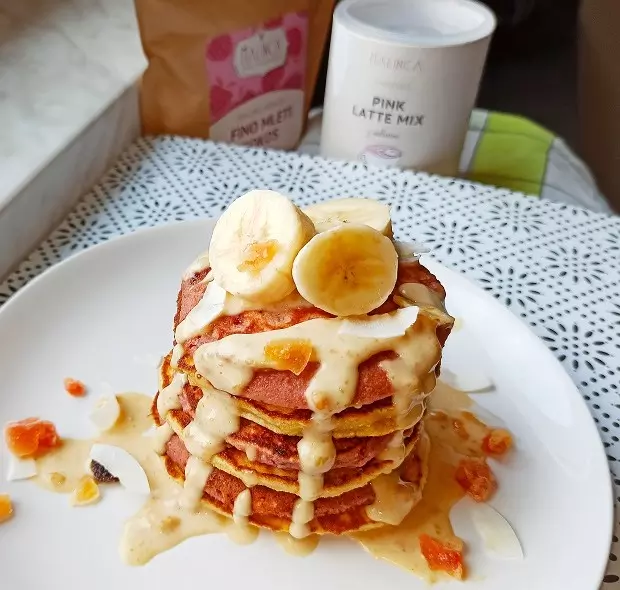 OPIS POSTUPKA: U zdjeli pomiješajte kokosovo, zobeno i rižino brašno i vinski kamen. U drugu posudu pjenjačom izmiješajte jaja, kefir ili jogurt i sol. Tijekom miješanja postupno dodajte mješavinu brašna da se sastojci sjedine i dobiju malo gušću masu nego kod običnih palačinki. Izlijte polovicu smjese u novu posudu i dodajte Pink latte mix. Tako smo dobili dvije smjese, običnu i smjesu ružičaste booje. Ostavite masu da se odmori najmanje 20 minuta prije pečenja. Palačinke pecite na kokosovom ulju; u jednu tavu idu 3 manje palačinke. Palačinke posložite jednu na drugu (bilo koja količina), jednu običnu i jednu ružičastu. Poslužite s preljevom od kikirikija i tropskim suhim voćem.