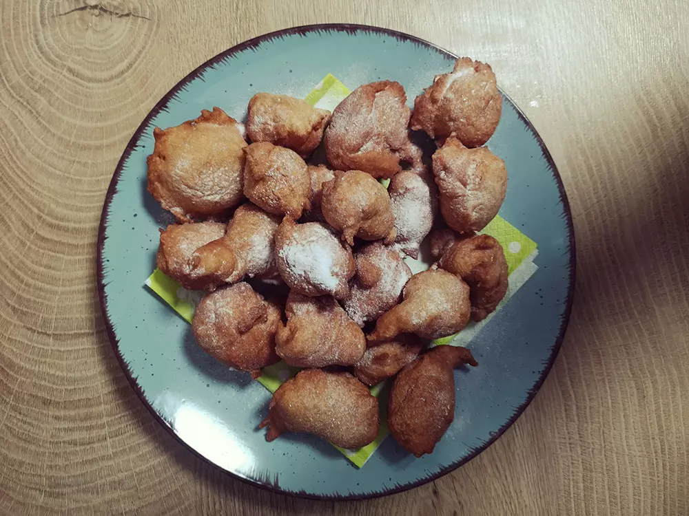 6. Pričekamo da se fritule ispeku do zlatno smeđe boje na jednoj strani, pa ih okrenemo i ispečemo još drugu stranu.