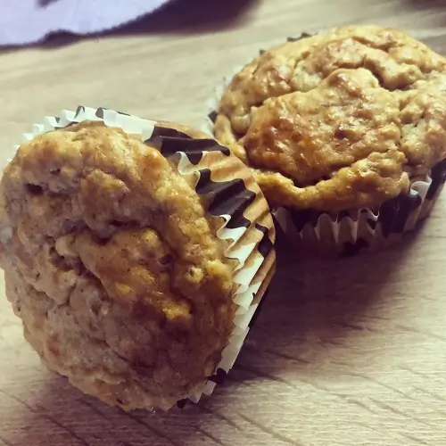 OPIS POSTUPKA: Bjelanjke promiješamo i dodamo još žumanjke. Polako dodajemo mokre sastojke, banane, grčki jogurt, vanilijevu aromu i kikirikijev maslac. Nakon toga dodamo još zobene pahuljice (možemo ih izmljeti u mikseru u glatku tekstutu), prašak za pecivo, masu stavimo u zdjelice i pečemo 15 minuta na 180 stupnjeva.