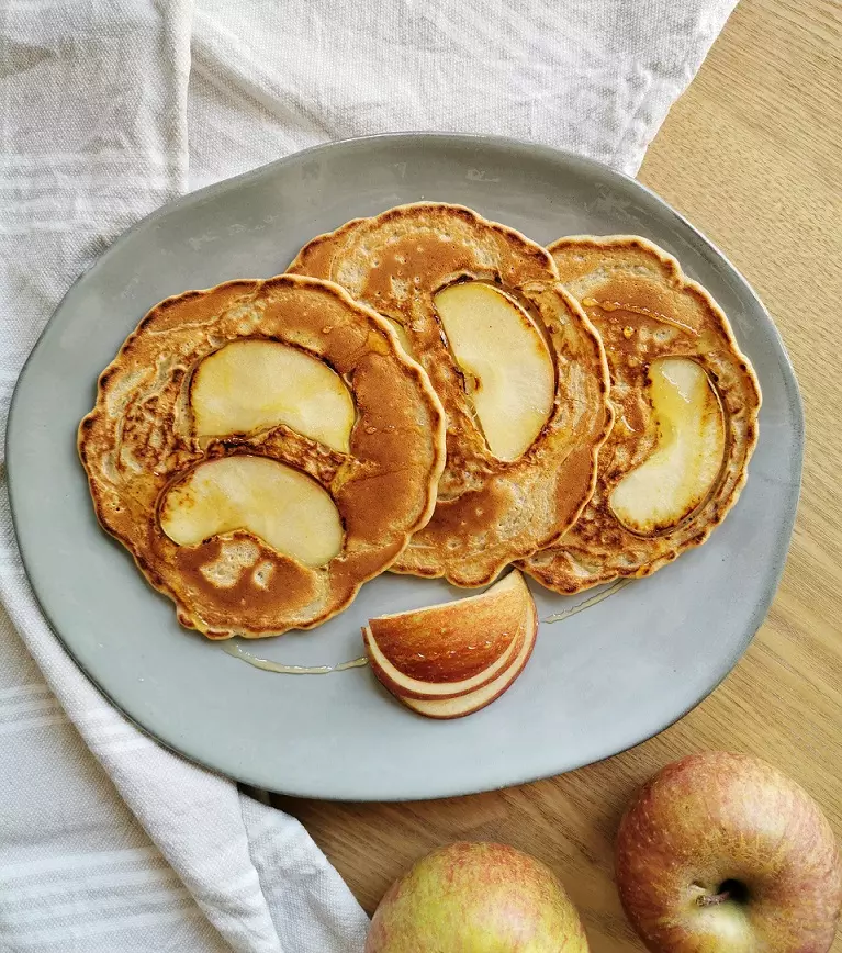 OPIS POSTUPKA: Jabuku prepolovite, izdubite koštice i narežite na tanke ploške. U velikoj zdjeli pomiješajte jaja s mlijekom, dodajte brašno, mljevene orahe i kokosov šećer, cimet i sol. Pomiješajte u glatku smjesu i dodajte još ekstrakta vanilije po ukusu. Podmažite posudu za palačinke s kapljicom maslinovog ulja, pričekajte minutu da se ulje zagrije, a zatim na sredinu posude prvo stavite dvije kriške jabuke i prelijte ih jednom mjericom smjese. Pokrijte posudu poklopcem i preokrenite palačinku kad gornja strana više ne bude tekuća. Palačinku pecite s druge strane još 2-3 minute, a zatim je stavite na tanjur i započnite s drugom. Palačinke možete poslužiti s medom, jabučnim octom ili marmeladom po izboru.