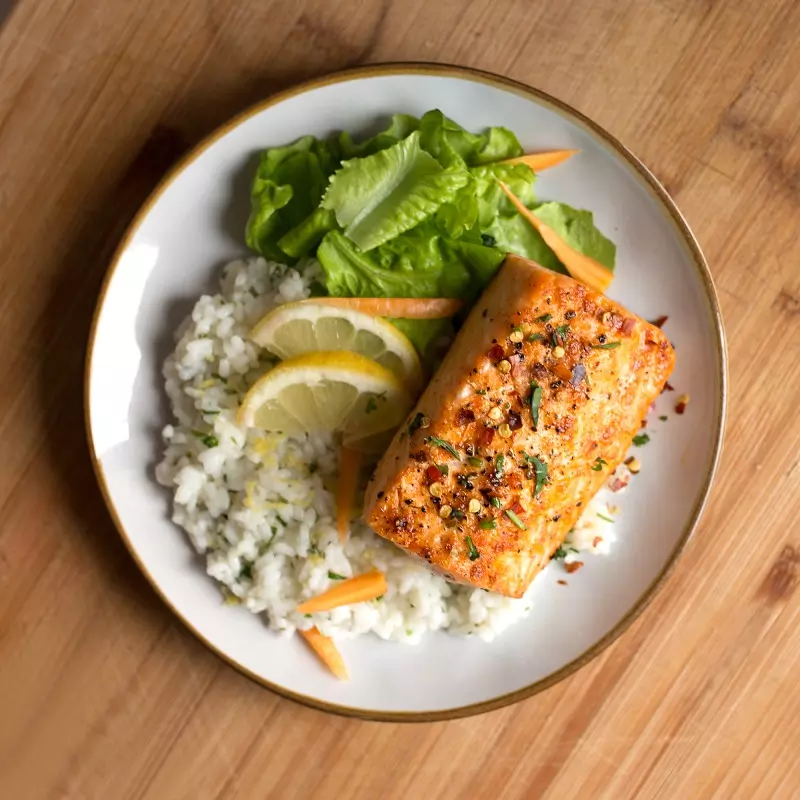 3. Filet lososa narežite na 2 veća ili 3 manja komada, premažite maslinovim uljem i začinite češnjakom, paprikom u prahu, soli i paprom. Zagrijte pećnicu na 200 °C i stavite losos u nju na cca. 10 minuta (ovisi o debljini lososa).