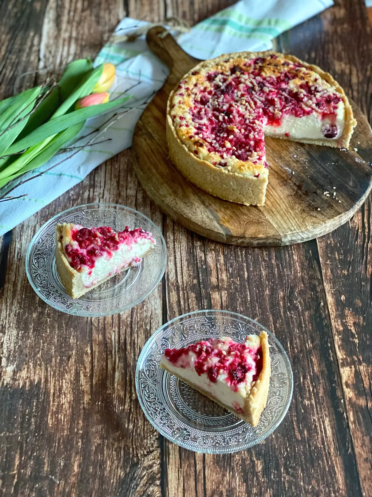OPIS POSTUPKA: Promjer kalupa za torte: 20cm (8-10 komada). Prvo počinjem pripremati tijesto. Prosijam oba brašna i dodam eritritol, sol, narezani omekšali maslac i vodu. Zamijesim tijesto od navedenih sastojaka. Tijesto podijelim na dva dijela - veći dio tijesta rasporedim po dnu kalupa i po rubu (radim oko 3 cm ruba), te ostavim manji komadić tijesta za kraj. Nakon toga slijedi priprema nadjeva od jogurta. Bjelanjke sam istukla u čvrst snijeg. Jogurtu dodam kiselo vrhnje, eritritol, limunovu koricu i brašno. Sve dobro izmiješam i na kraju kuhačom ručno umiješam bjelanjke u kremu. Preko tijesta stavim kremu i po vrhu dodam smrznute maline i ribano tijesto. Stavim pitu u pećnicu na 40 minuta na 190°C (uz ventilaciju). Pečenu pitu ostavim da odstoji najmanje dva sata da se ohladi.
