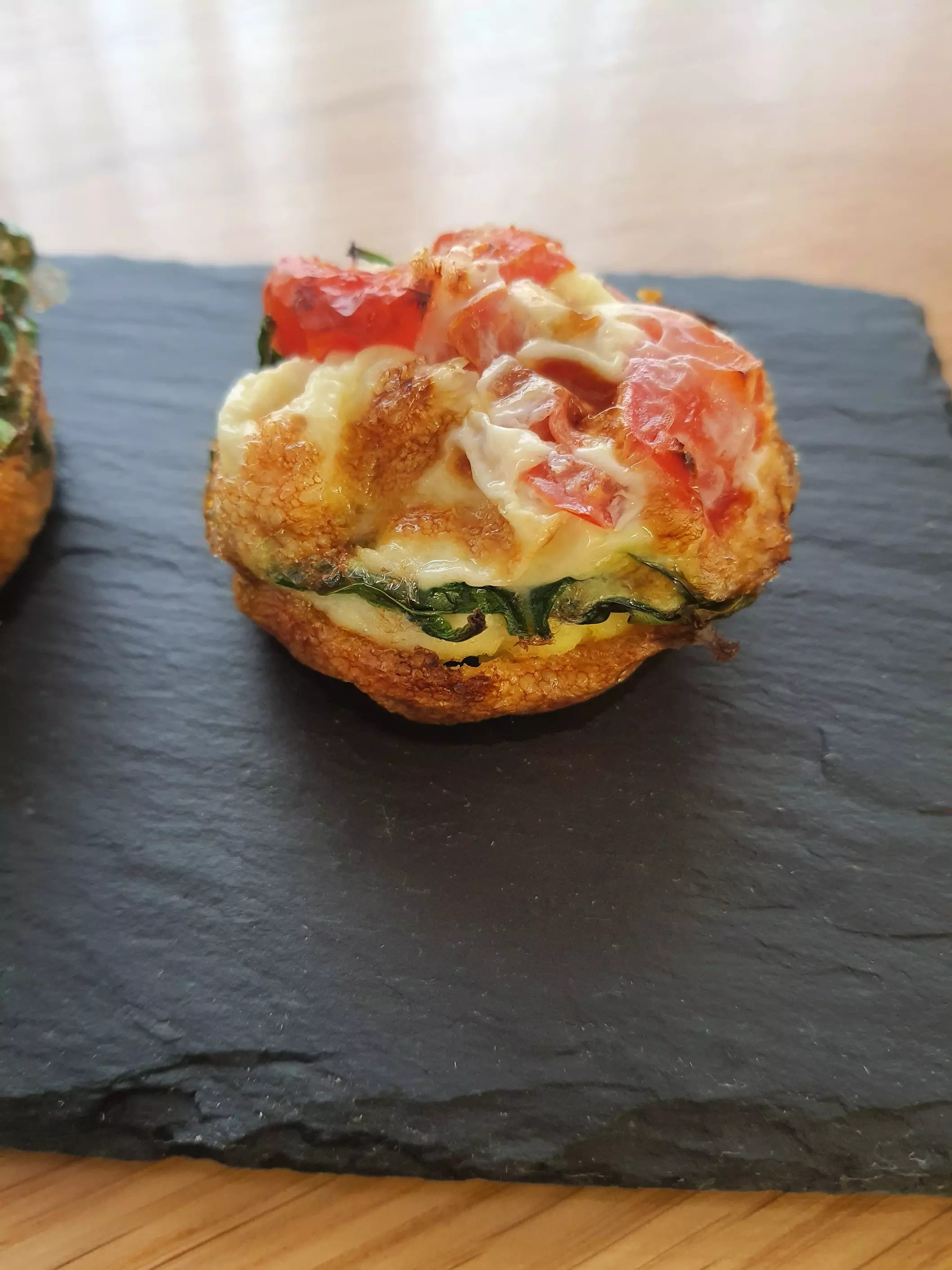 OPIS POSTUPKA: Rajčice narežemo na kockice, a svježe listove špinata malo nasjeckamo. Kalup za muffine premažemo kokosovim uljem. Otvore napunimo rajčicama i špinatom te prelijemo umućenim bjelanjcima. Posolimo i popaprimo. Pečemo na 200° oko 10 minuta, odnosno dok površina lagano ne požuti.