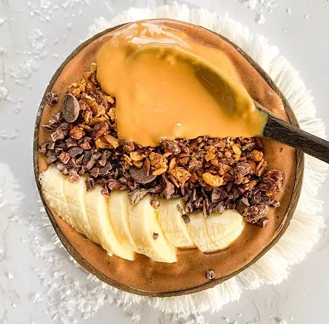 OPIS POSTUPKA: Sve sastojke dobro izmiješajmo u multipraktiku ili blenderu. Poslužimo u šalici, ukrasimo maslacem od kikirikija, granolom i polovicom narezane banane.